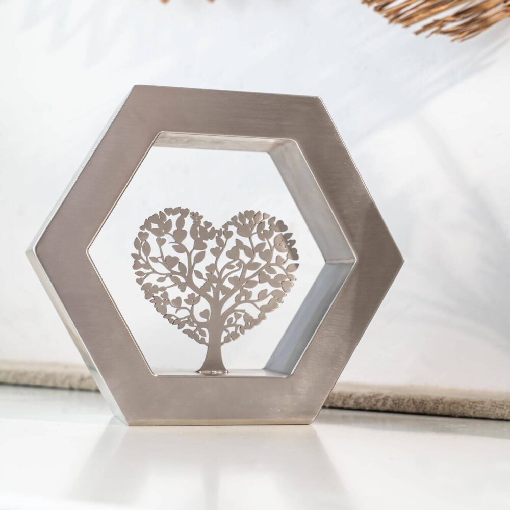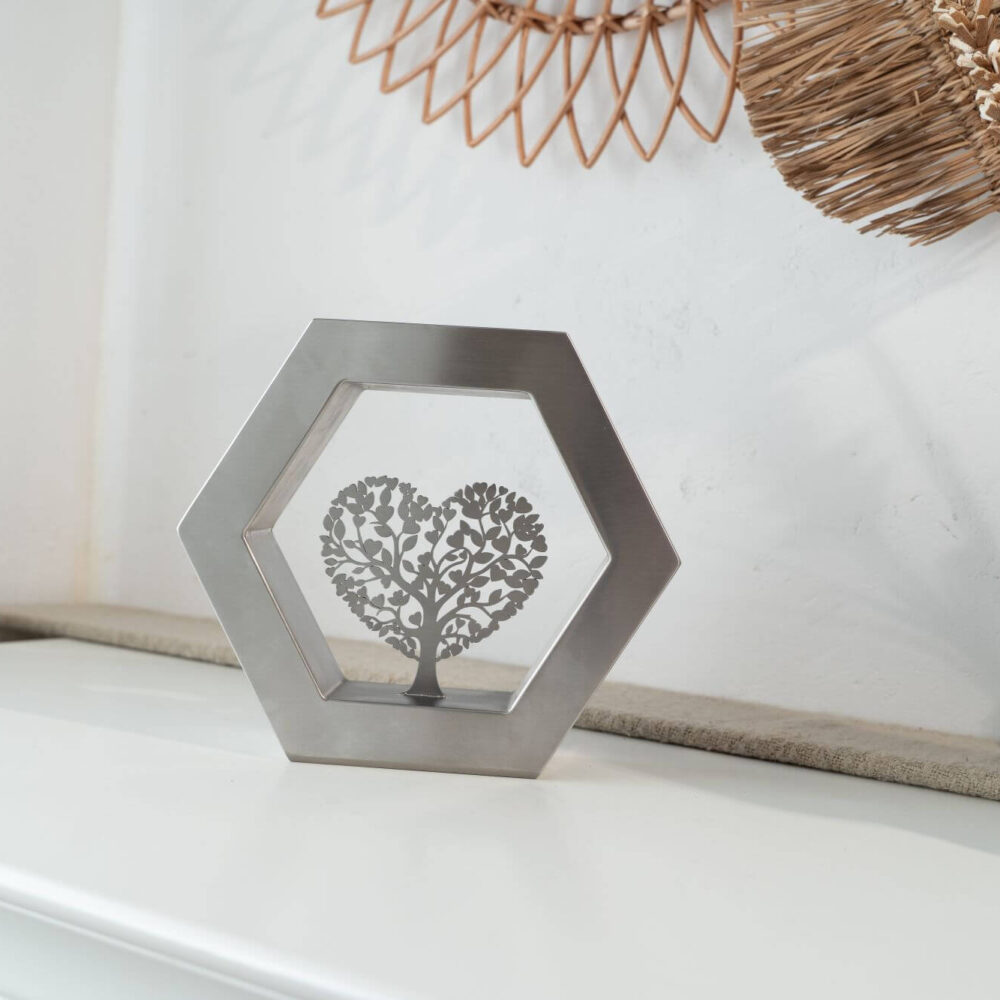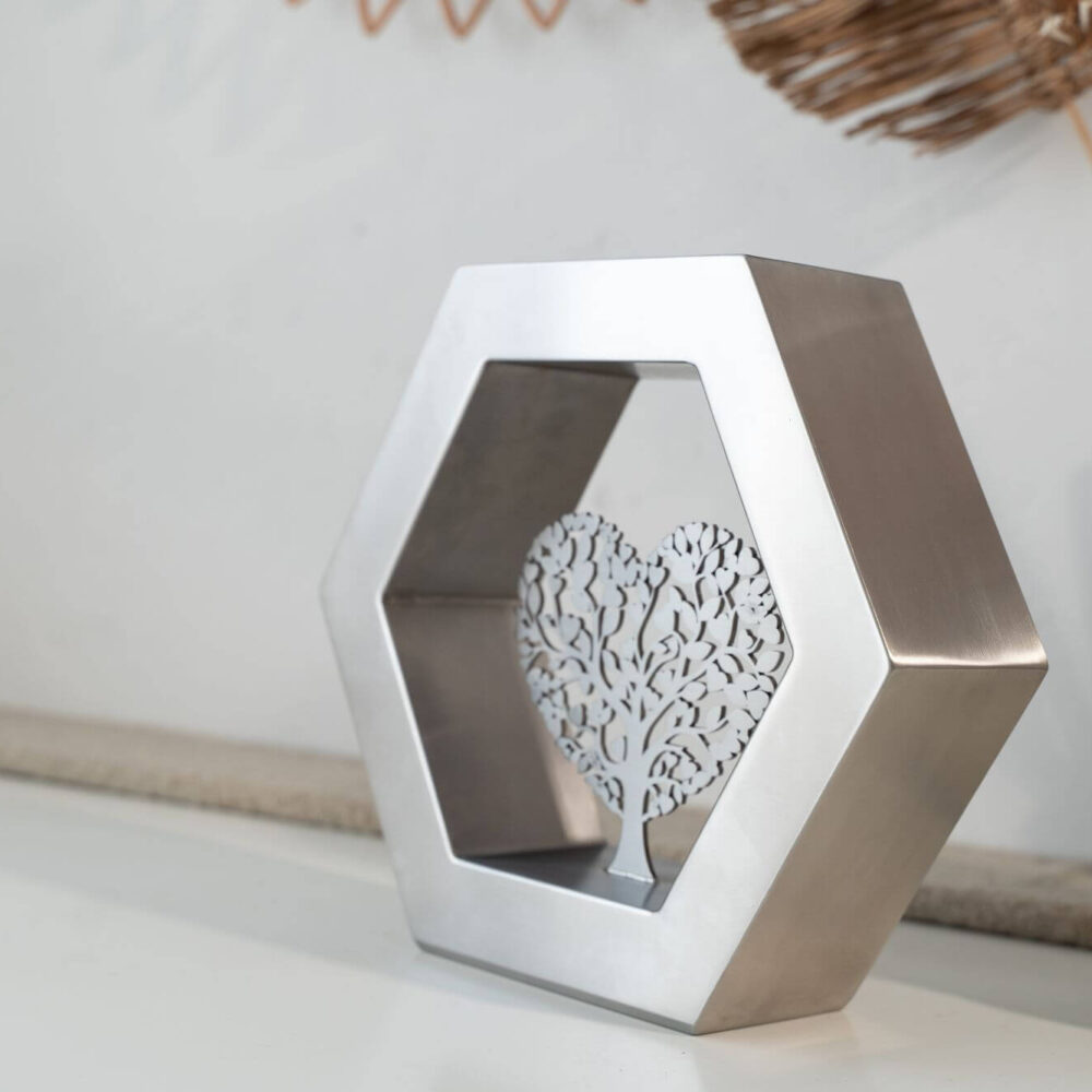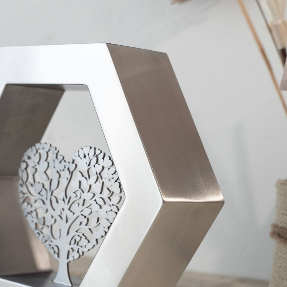 De Hexagon ‘Arbor Caelestis’ (De Hemelse Boom) RVS-geslepen is een elegant gedenkobject dat staat voor harmonie, balans en blijvende verbondenheid. De zeshoek, geïnspireerd op natuurlijke structuren, symboliseert stabiliteit en oneindige samenhang. Deze moderne urn of gedenkurn is volledig vervaardigd uit duurzaam RVS en rondom afgewerkt met een verfijnde K320-slijping. Zo straalt de Hexagon ‘Arbor Caelestis’ ingetogen klasse en vakmanschap uit. De egale, zilverachtige RVS-afwerking versterkt de rust en kracht van het ontwerp, waardoor elke herinnering op een stijlvolle manier wordt gekoesterd.