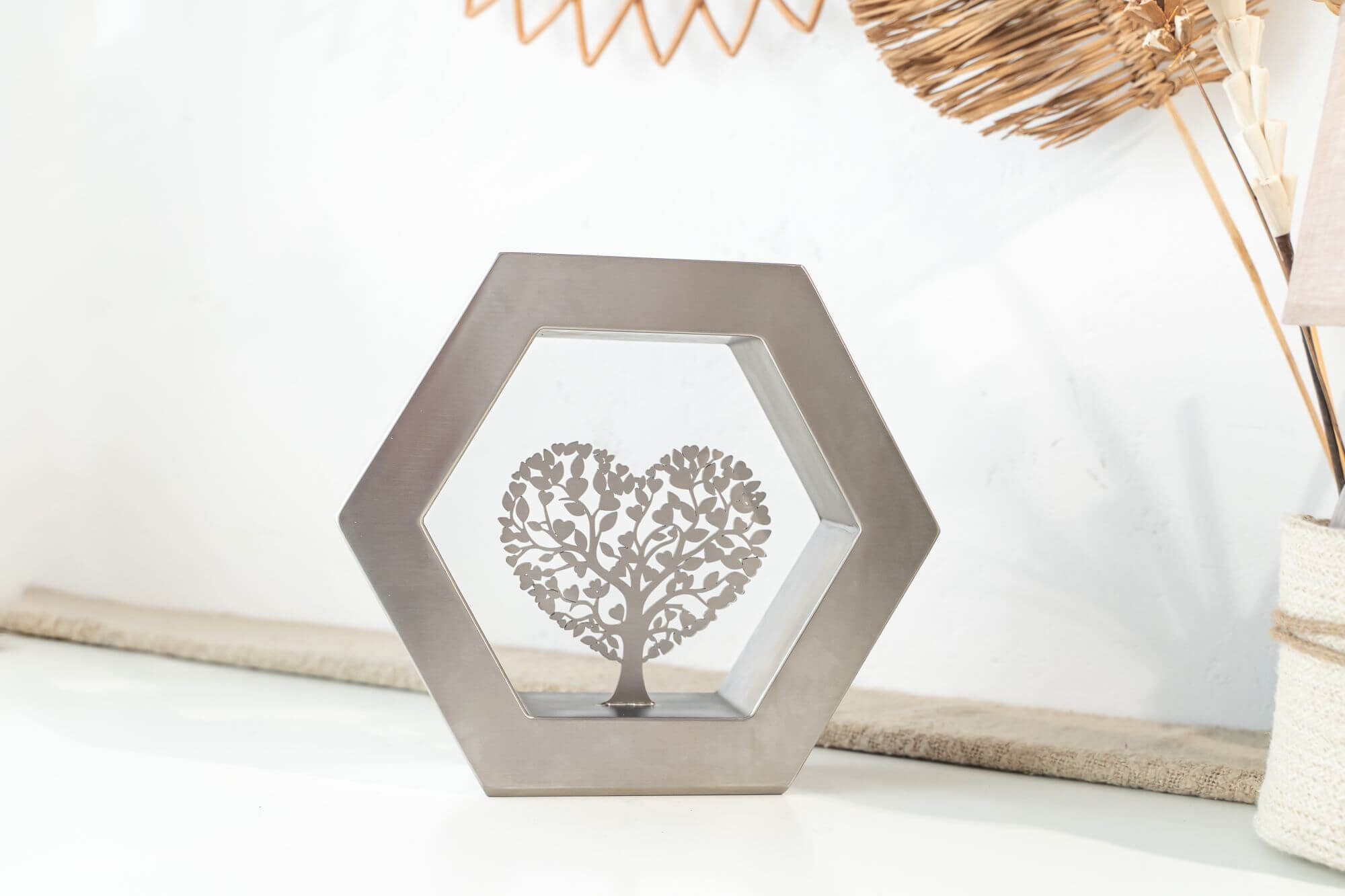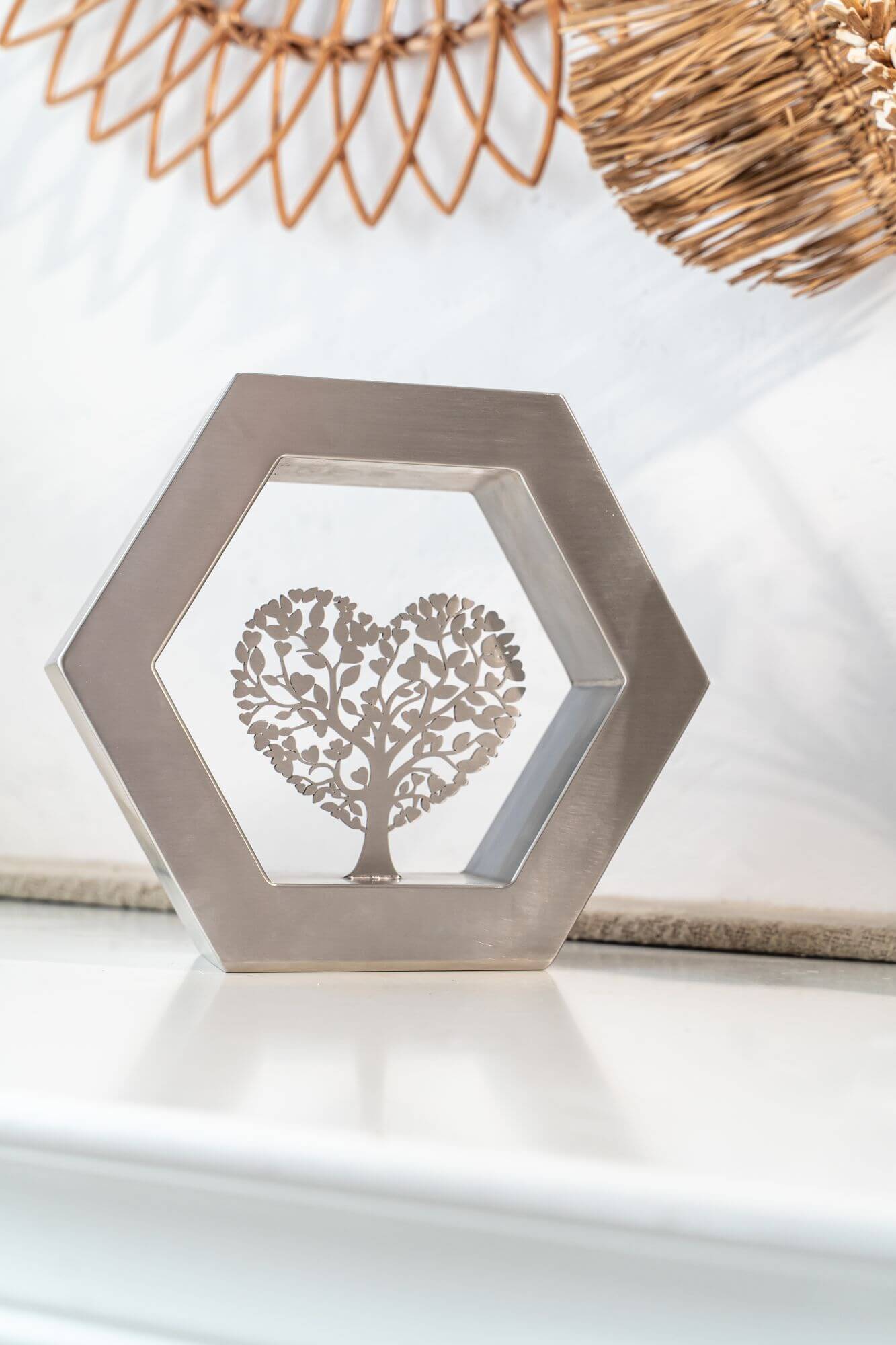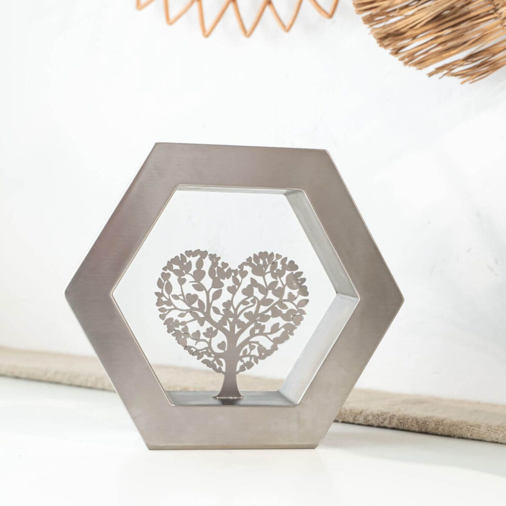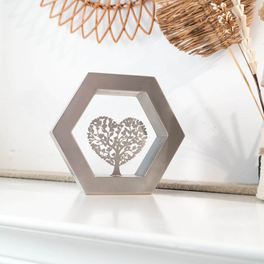 De Hexagon ‘Arbor Caelestis’ (De Hemelse Boom) RVS-geslepen is een elegant gedenkobject dat staat voor harmonie, balans en blijvende verbondenheid. De zeshoek, geïnspireerd op natuurlijke structuren, symboliseert stabiliteit en oneindige samenhang. Deze moderne urn of gedenkurn is volledig vervaardigd uit duurzaam RVS en rondom afgewerkt met een verfijnde K320-slijping. Zo straalt de Hexagon ‘Arbor Caelestis’ ingetogen klasse en vakmanschap uit. De egale, zilverachtige RVS-afwerking versterkt de rust en kracht van het ontwerp, waardoor elke herinnering op een stijlvolle manier wordt gekoesterd.