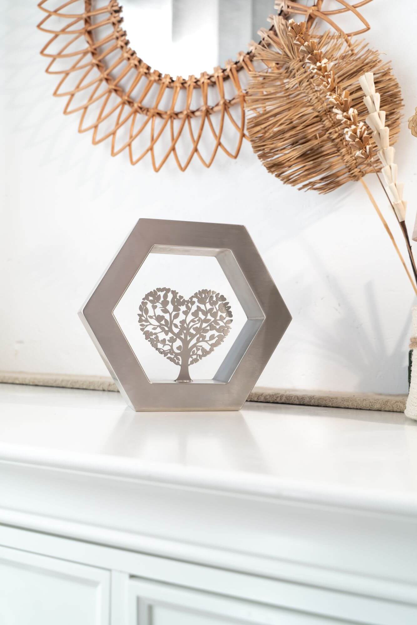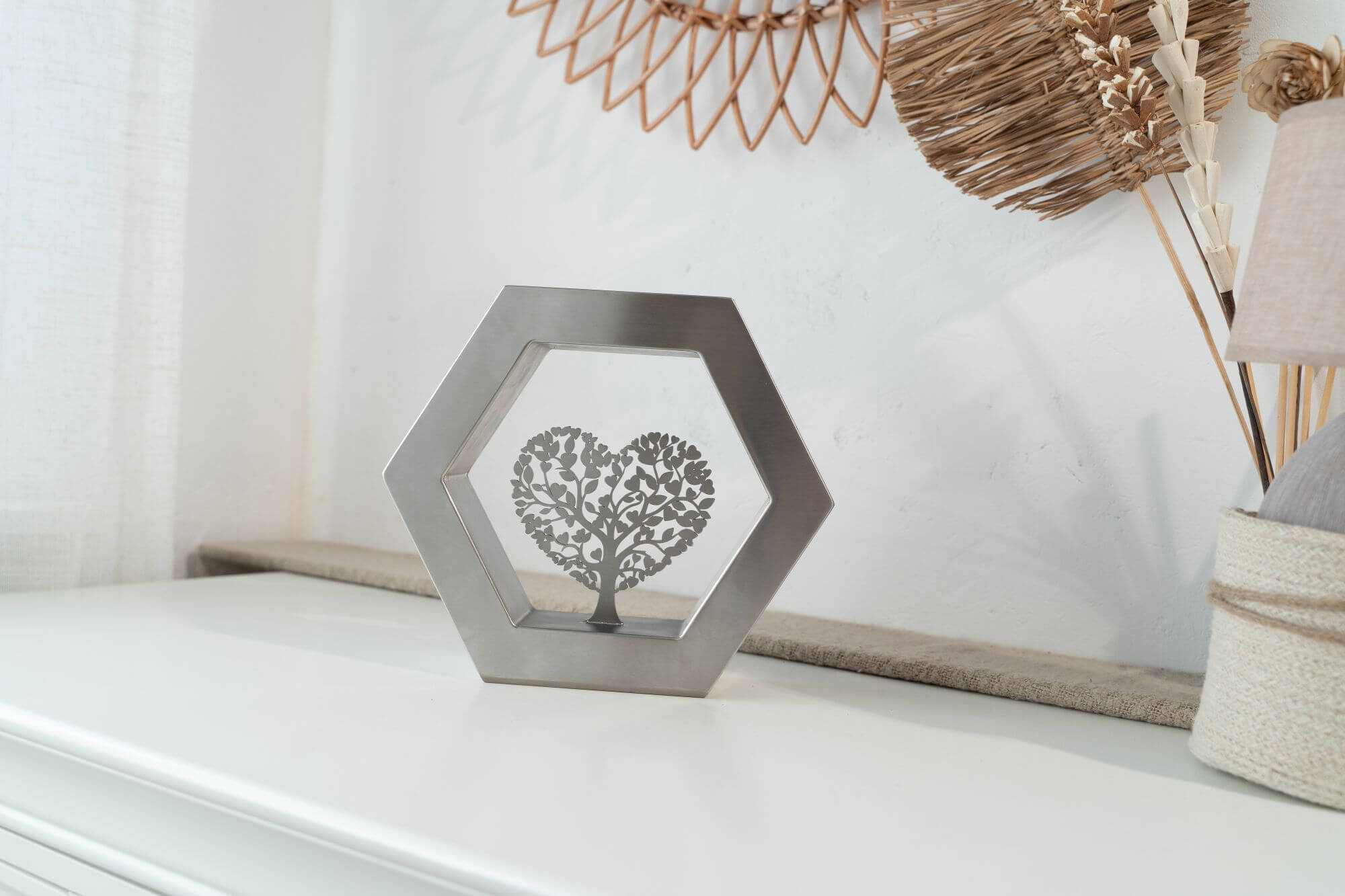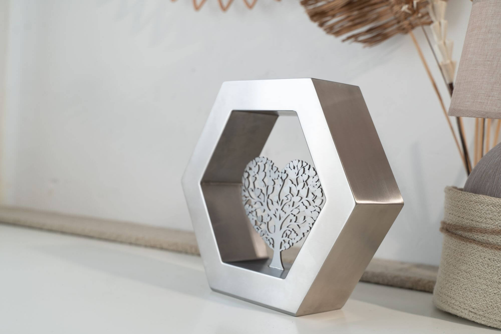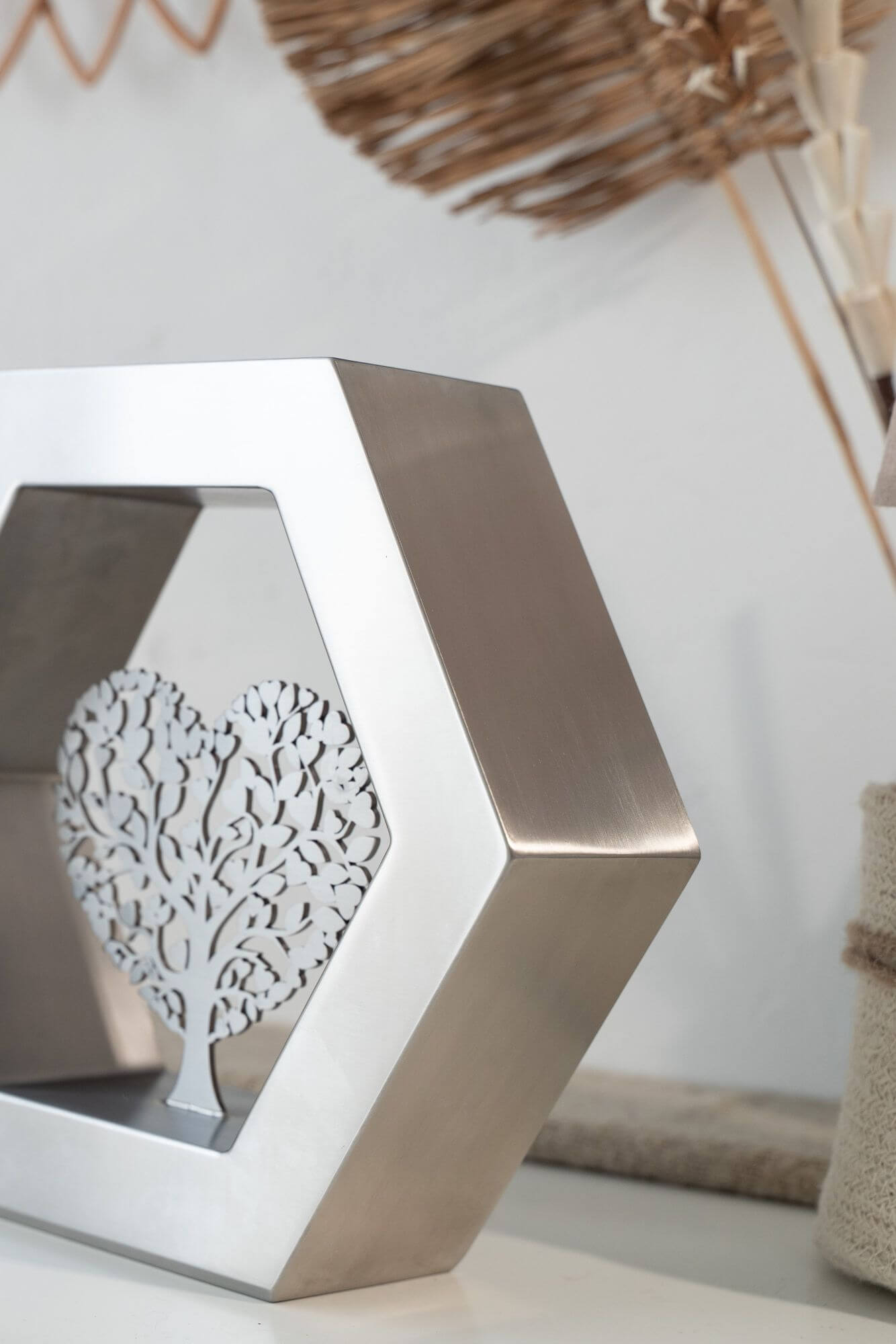 De Hexagon ‘Arbor Caelestis’ (De Hemelse Boom) RVS-geslepen is een elegant gedenkobject dat staat voor harmonie, balans en blijvende verbondenheid. De zeshoek, geïnspireerd op natuurlijke structuren, symboliseert stabiliteit en oneindige samenhang. Deze moderne urn of gedenkurn is volledig vervaardigd uit duurzaam RVS en rondom afgewerkt met een verfijnde K320-slijping. Zo straalt de Hexagon ‘Arbor Caelestis’ ingetogen klasse en vakmanschap uit. De egale, zilverachtige RVS-afwerking versterkt de rust en kracht van het ontwerp, waardoor elke herinnering op een stijlvolle manier wordt gekoesterd.