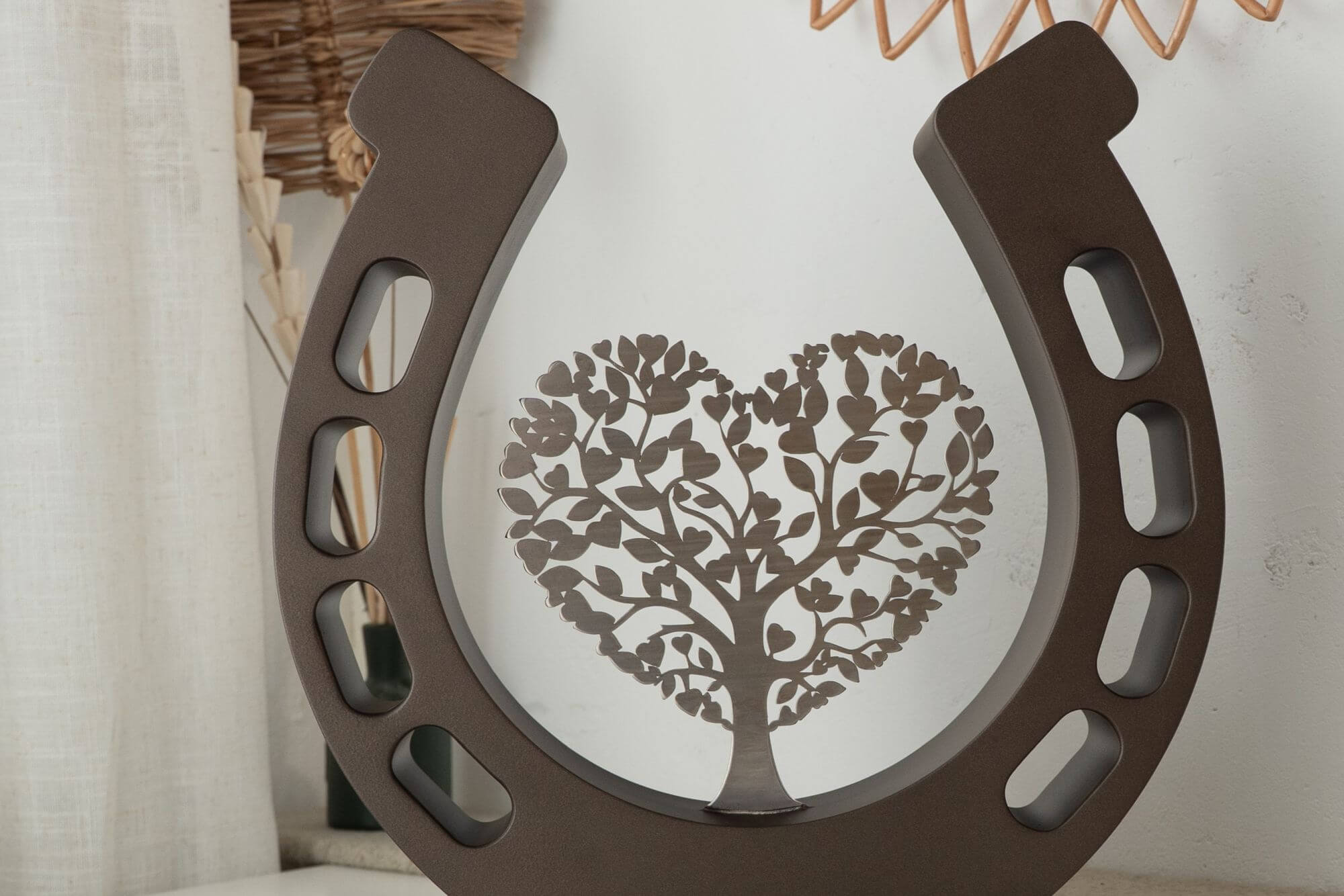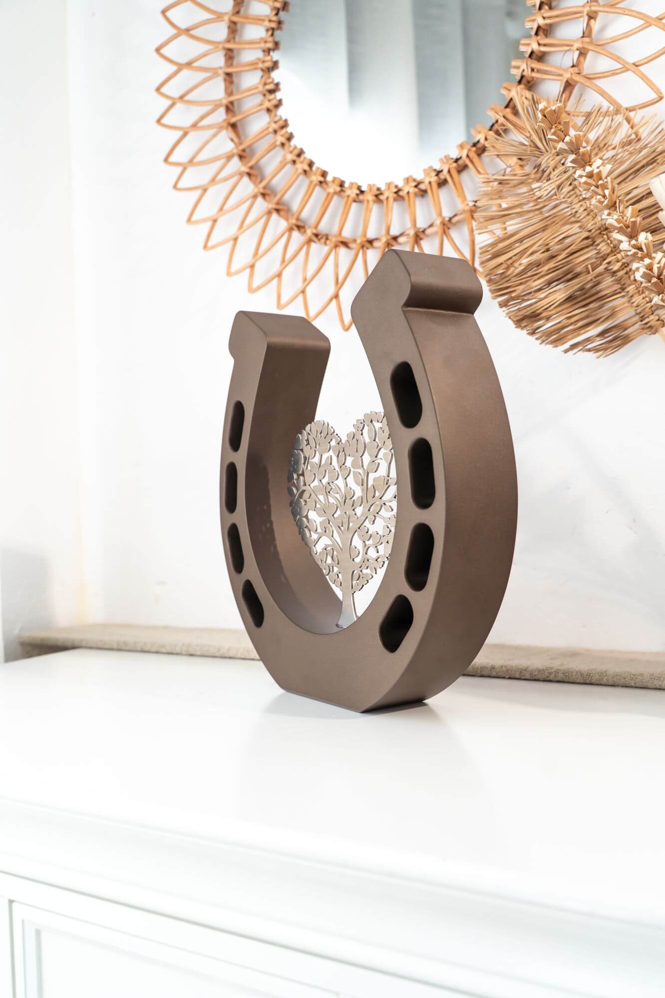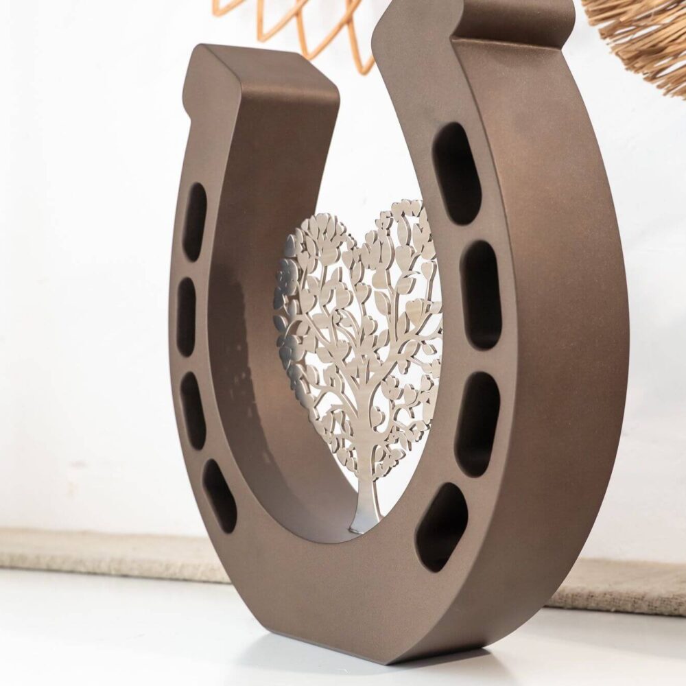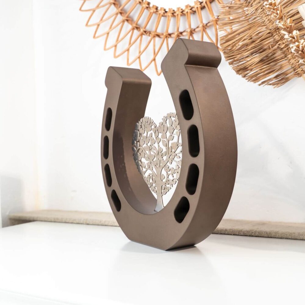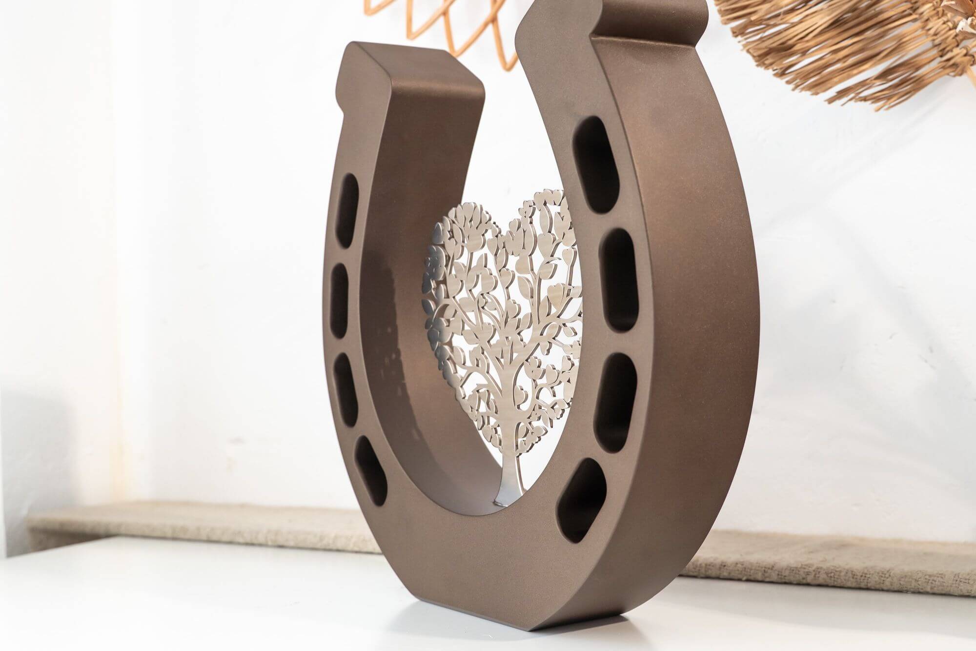 De Hoefijzer Memoria Arboris (Boom van Herinnering) RVS-gecoat Antraciet/Bronsachtig-bruin is een stijlvol en handgemaakt herinneringsmonument van hoogwaardig roestvrij staal (RVS). Dit exclusieve gedenkornament straalt luxe, duurzaamheid en vakmanschap uit en vormt een bijzondere plek om het as of resomeerpoeder van uw dierbare te bewaren. Het ontwerp is ideaal voor een prominente plaats binnenshuis, zoals op een eettafel, vensterbank, in een vitrine of op een persoonlijke gedenk- of herinneringsplek.